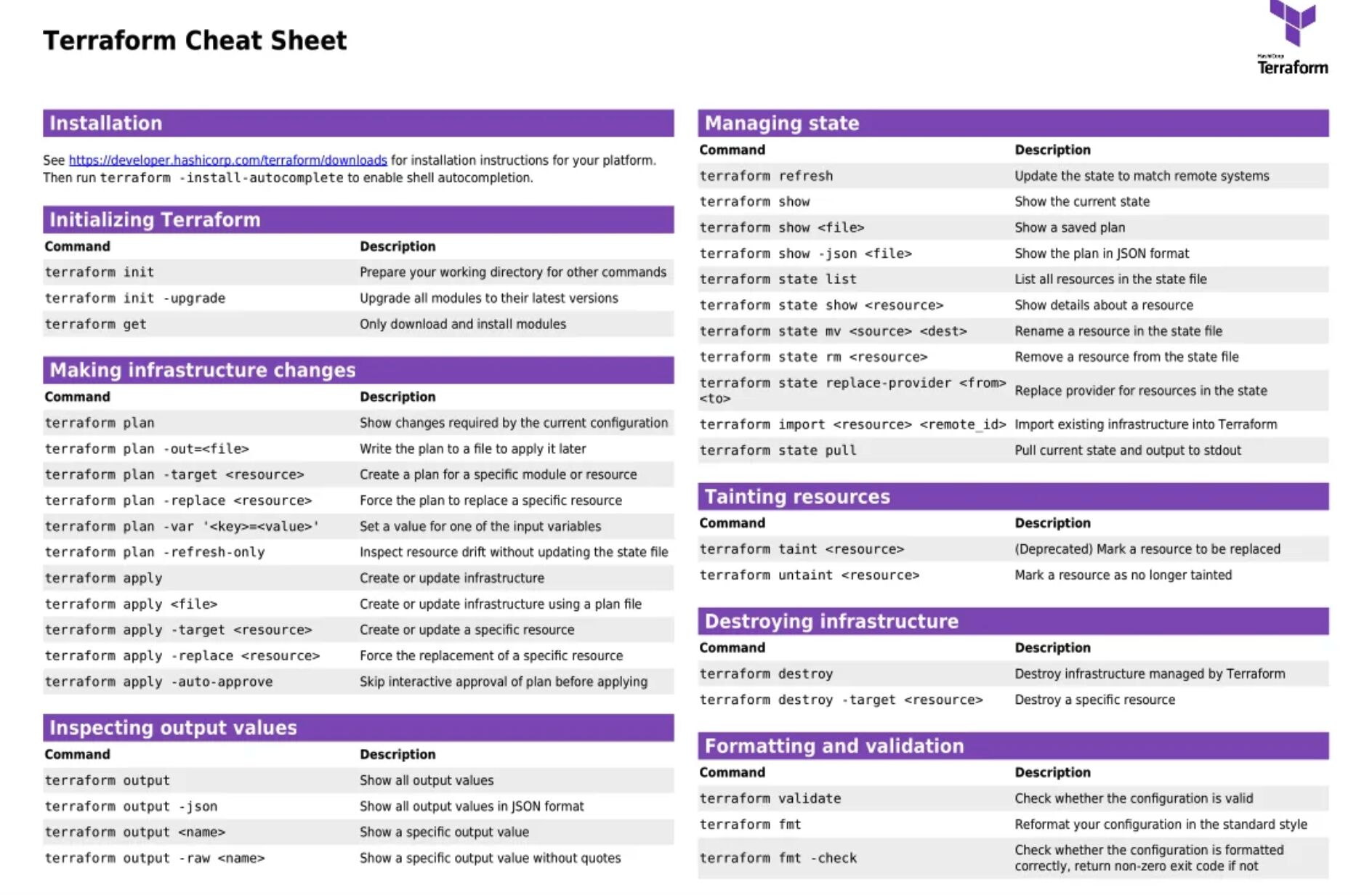 Terraform_cheat_sheet Terraform Cheat sheet Related pages Terraform overview Terraform interview questions Question bank: Senior DevOps Question bank: Terraform
